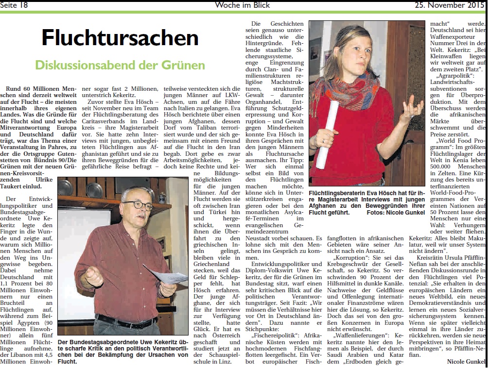 Rund 60 Millionen Menschen sind derzeit weltweit auf der Flucht - die meisten innerhalb ihres eigenen Landes. Was die Gründe für die Flucht sind und welche Mitveranwortung Europa und Deutschland dafür trägt. war das Thema einer Veranstaltung in Pahres, zu der die Ortsgruppe Gutenstetten von Bündnis 90(Die Grünen mit der neuen Grünen-Kreisvorsitzenden Ulrike Taukert einlud. Als Experten informierten Eva Hösch, die in Wien "Internationale Entwicklung" und in Tübingen "Vergleichende Nahostwissenschaften" studierte und ihre Masterarbeit zum Thema "Unbegleitete Flüchtlinge aus Afghanistan" schrieb, und Uwe Kekeritz, Bundestagsabgeordneter und entwicklungspolitischer Sprecher der Fraktion von Bündnis 90/Die Grünen, die Anwesenden über Fluchtursachen und Beweggründe sowie Hintergründe afgahnaischer Flüchtlinge.