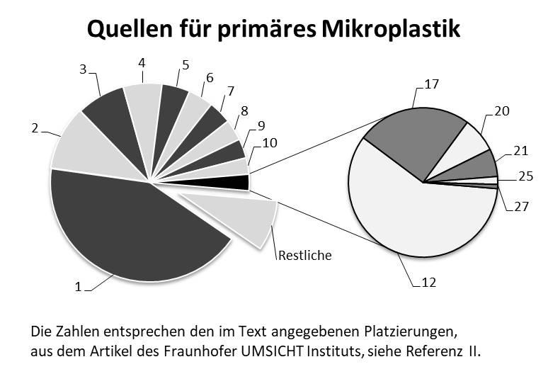 Eine Studie des Fraunhofer Instituts für Umwelt- Sicherheits- & Energietechnik UMSICHT (2018) kam zu folgendem Ergebnis: „Zu den Top 10 (Anmerkung: relevanten Quellen für primäres Mikroplastik, Platzierung wird in Klammern angegeben) gehören nach unserer Analyse: Abrieb von Reifen (1), Emissionen bei der Abfallentsorgung (2), Abrieb von Polymeren und Bitumen in Asphalt (3), Pellet-verluste (4), Verwehungen von Sport- und Spielplätzen (5), Freisetzung auf Baustellen (6), Abrieb von Schuhsohlen (7), Kunststoffverpackungen (8), Fahrbahnmarkierungen (9), Faserabrieb bei der Textilwäsche (10).“ Weitere ausgewählte Quellen sind: Abrieb landwirtschaftlich genutzter Kunststoffe (12), Kosmetika (17), Abrieb von Dekomaterial, Glitter, Konfetti etc. (20), Inhaltsstoffe von Wasch-, Pflege-, Reinigungsmitteln privater Haushalte (21) und Zusatz in Medikamenten (25), Fragmentierung Pyrotechnik (27; Anmerkung: Feuerwerk). (II)