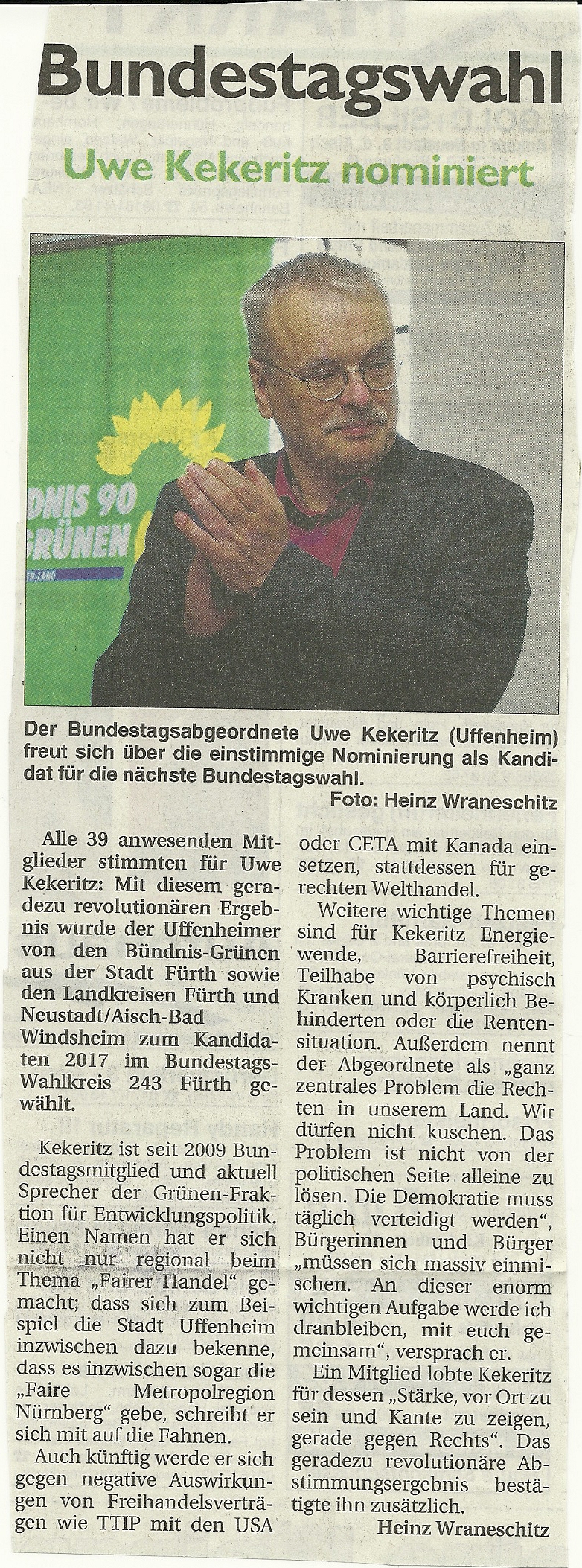 Alle 39 anwesenden Mitglieder stimmten letzten Samstag auf der Aufstellungsversammlung in Fürth für Uwe Kekeritz als Kandidaten für die Bundestagswahl 2017 im Wahlkreis 243 Fürth.