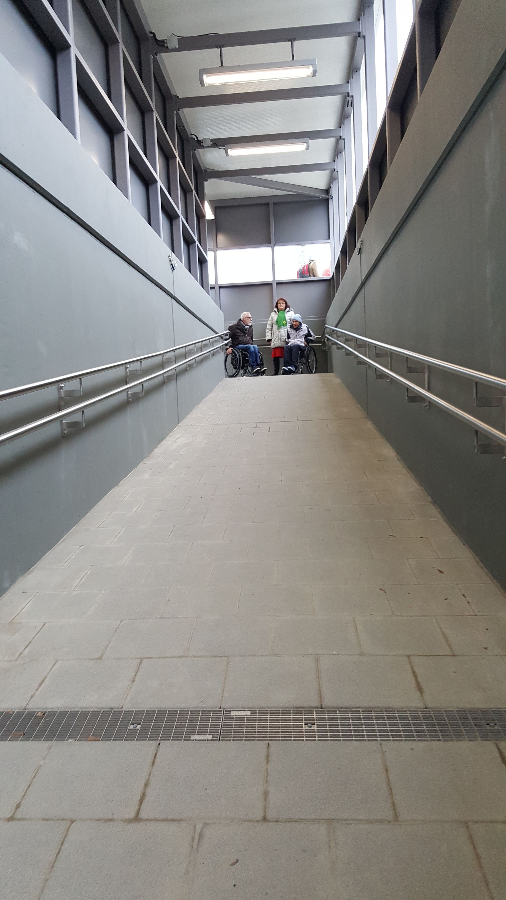 Für ca. 8,4 Mio Euro wurde die Bahnhofsanlagen grundlegend umgebaut. Damit war auch gesetzlich geboten, dass der Umbau Rollstuhlfahrern, alten Menschen und Müttern mit Kinderwägen gerecht wird. Dem ist aber nicht so, war auch nie so geplant. Das bestätigen sechs gelbe Warnschilder an den Rampen des neuen Bahnhofs, die das Symbol für Rollstuhlfahrer rot durchgestrichen zeigen und im Text klar darauf hinweisen: „Für Rollstuhlfahrer nicht geeignet“. Das ist auch gut so, denn die Rampen sind viel zu steil und zu gefährlich für Rollstuhlfahrer.