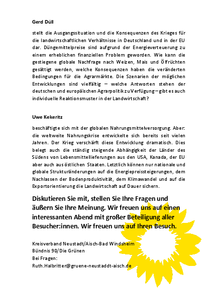 Pandemie und Krieg zeigen uns sehr deutlich wie groß unsere Abhängigkeit von anderen Ländern ist und wie erpressbar wir sind. Das betrifft nicht nur den Energiebereich, Handwerk und Handel, sondern genauso unsere Ernährung und damit auch die gesamte landwirtschaftliche Produktion. Dieser Dschungel von Verstrickungen ist sehr schwer zu durchschauen. Wir wollen Informationen weitergeben und mit Ihnen/Euch diskutieren.