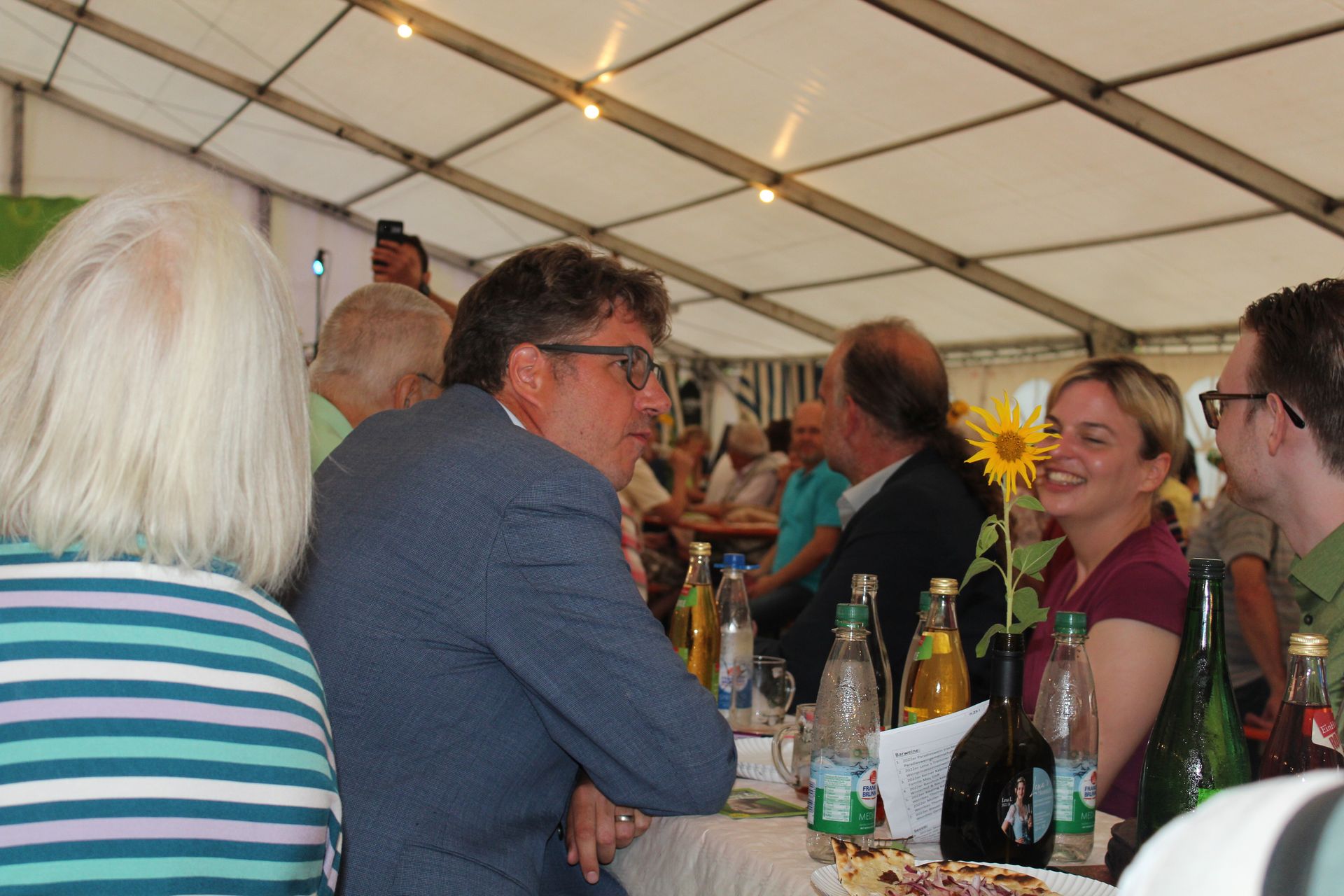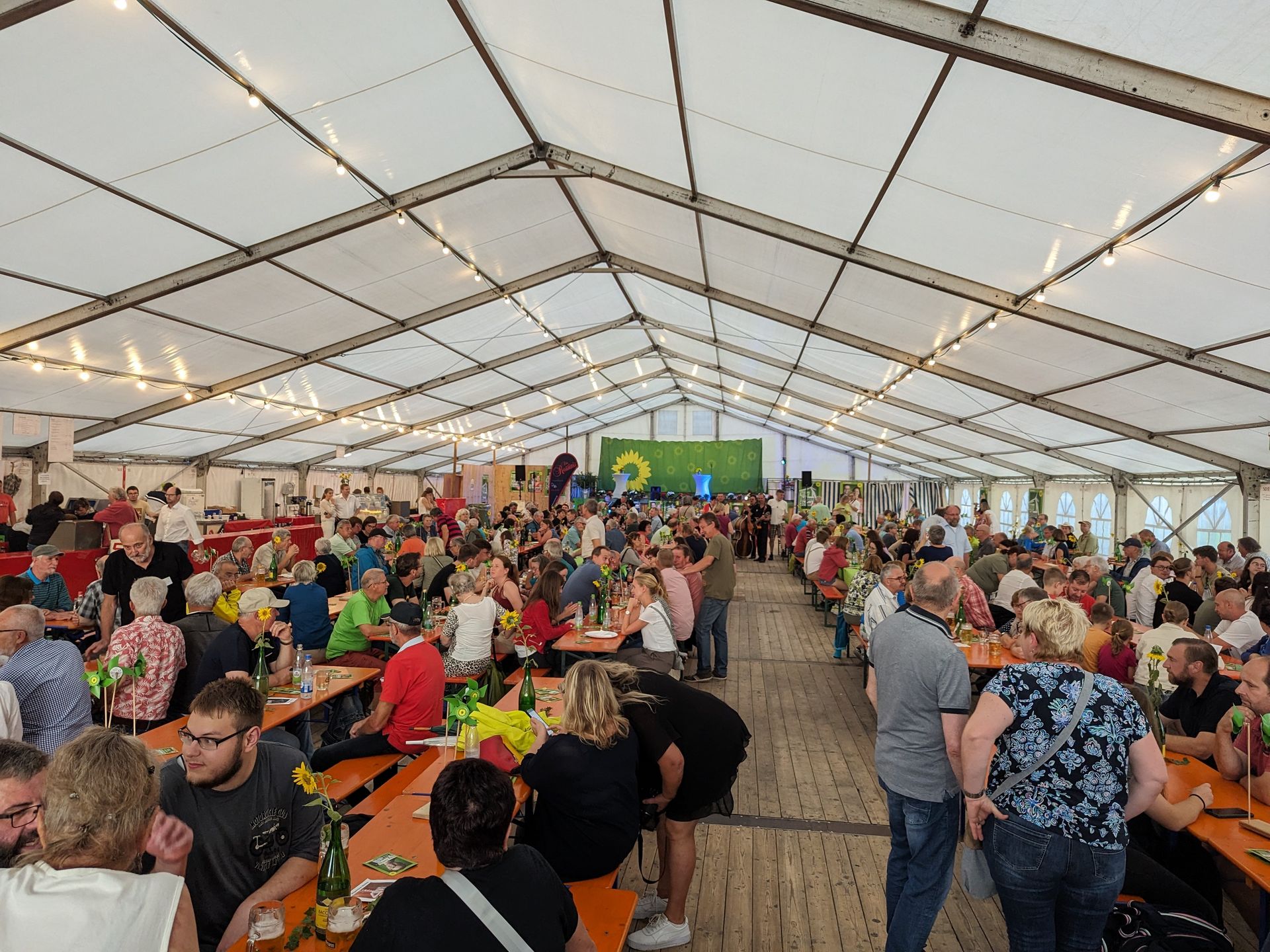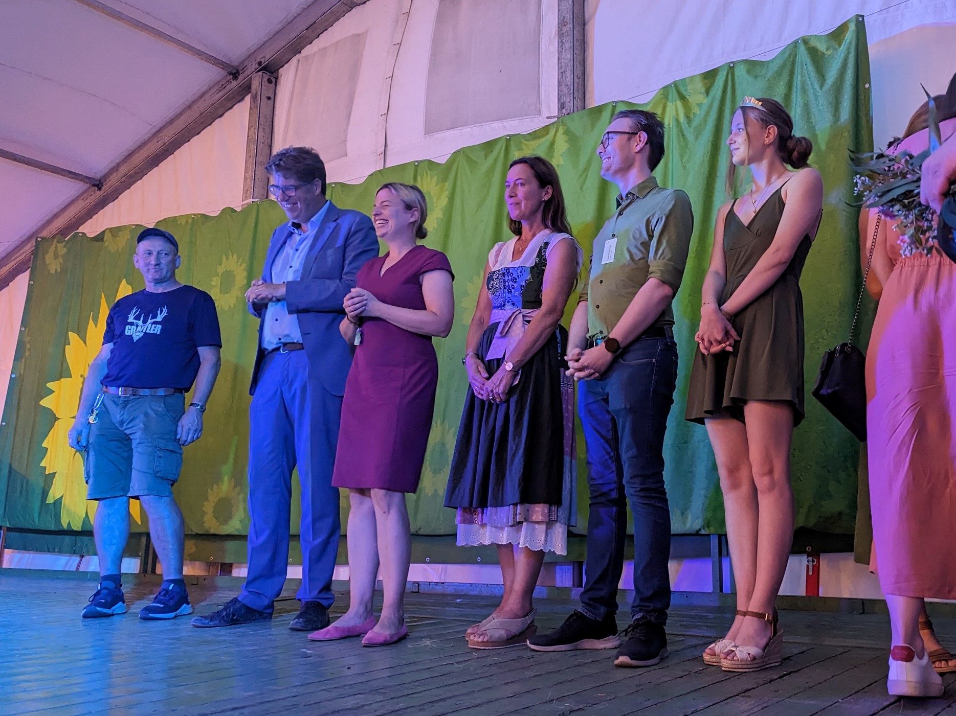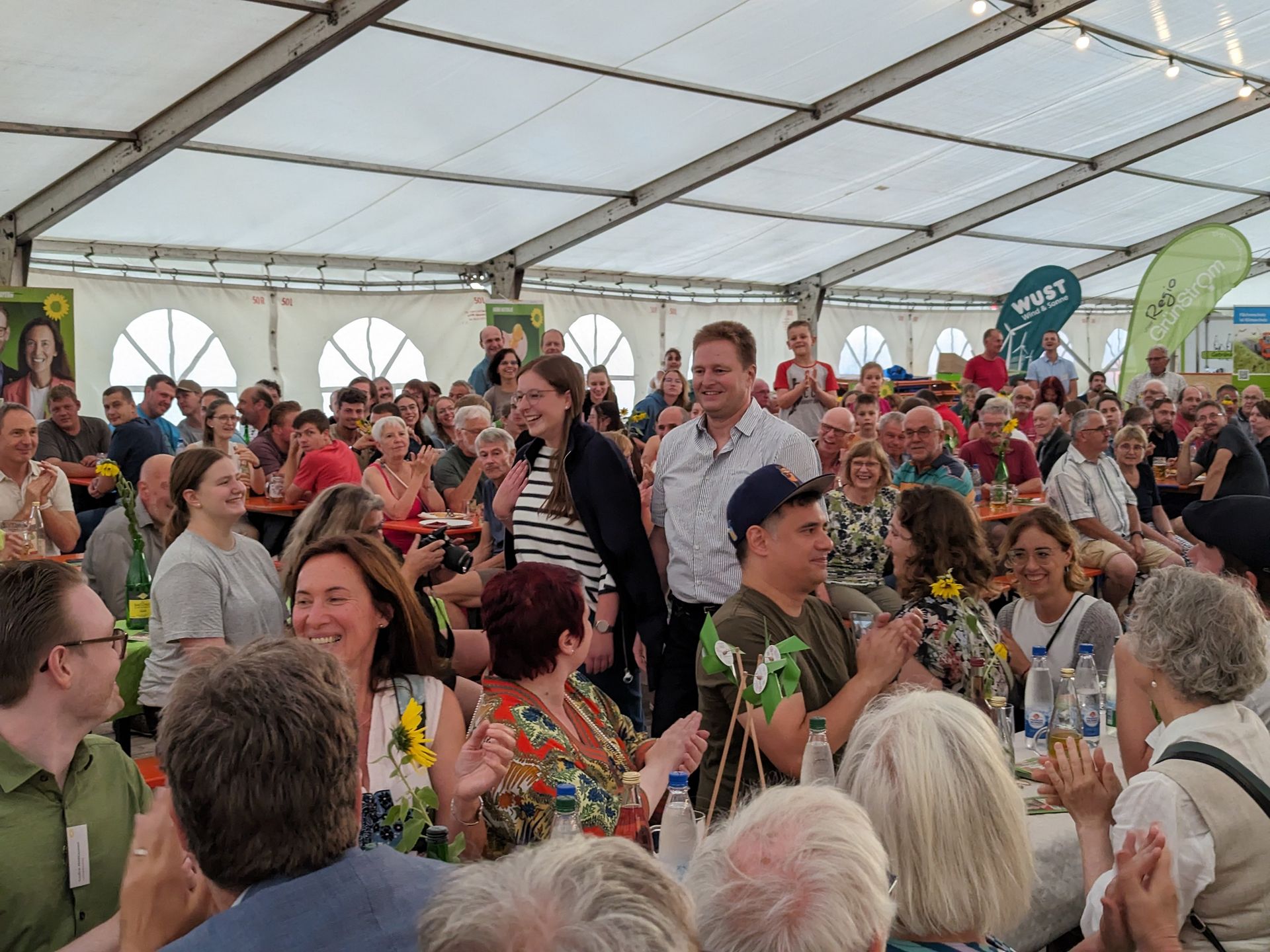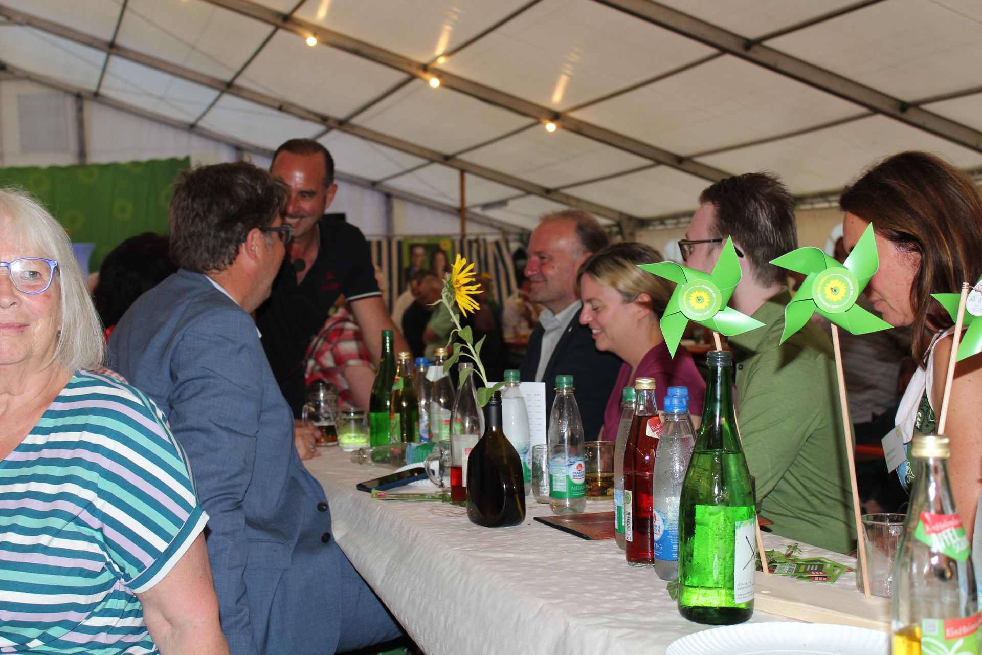Katharina Schulze, unsere Spitzenkandidatin der Landtagswahl im Herbst, rockte gut gelaunt und energiegeladen das volle Weinzelt. Sie machte Stimmung, zog die anderen Gäste mit in ihren Bann und sprach bei ihrem Herzensthema Familienpolitik sicher vielen aus der Seele. Auch der Parlamentarische Staatssekretär im Wirtschaftsministerium, Michael Kellner, hatte sichtlich Spaß am Unterhaltungsprogramm, klatschte mit und sprach auf der Bühne viele wichtige Themen an. An den Infotischen zeigten sich beide sehr interessiert und auch im persönlichen Gespräch nahmen sie sich allen Anliegen an, welche an sie herangetragen wurden.