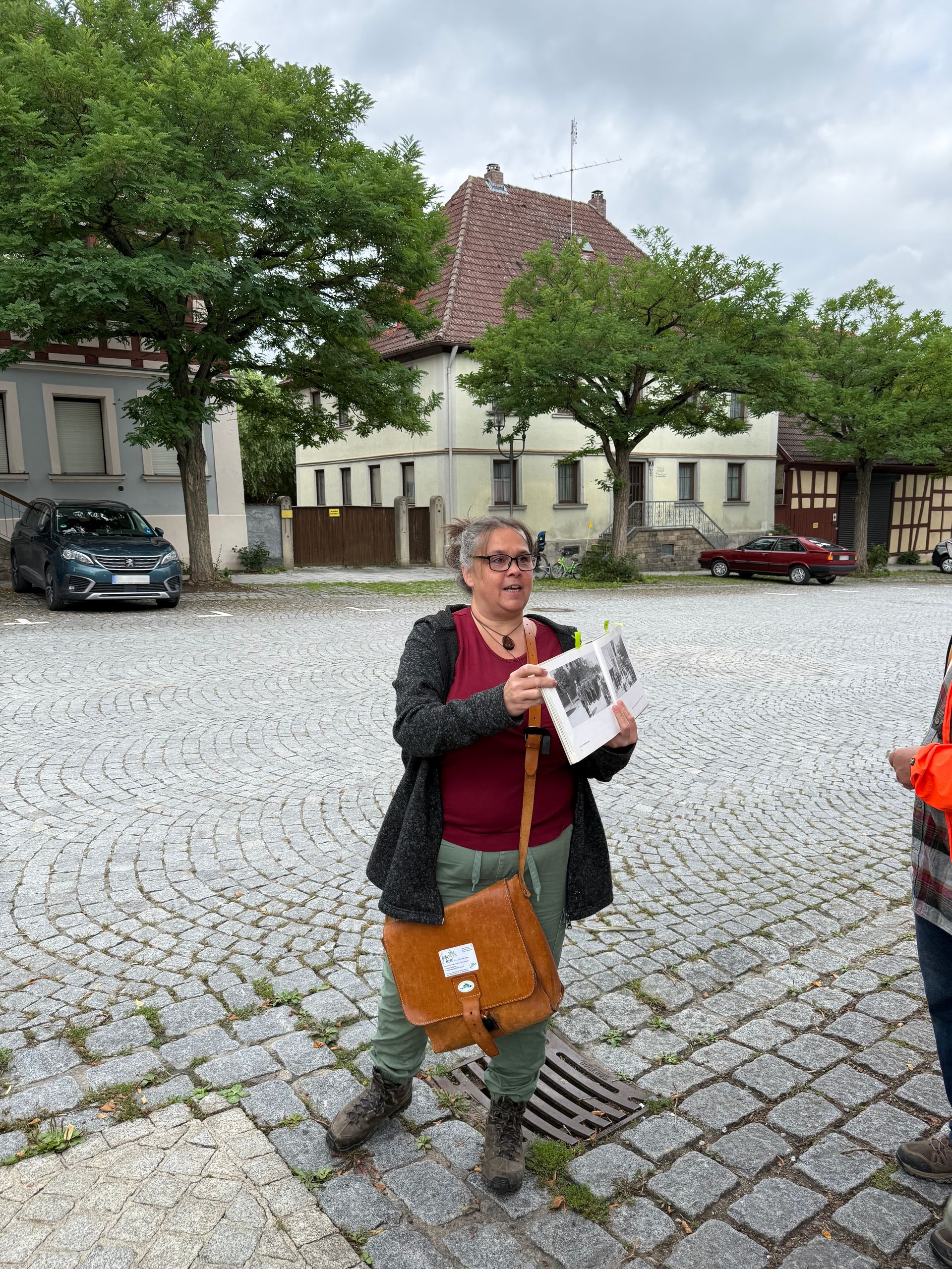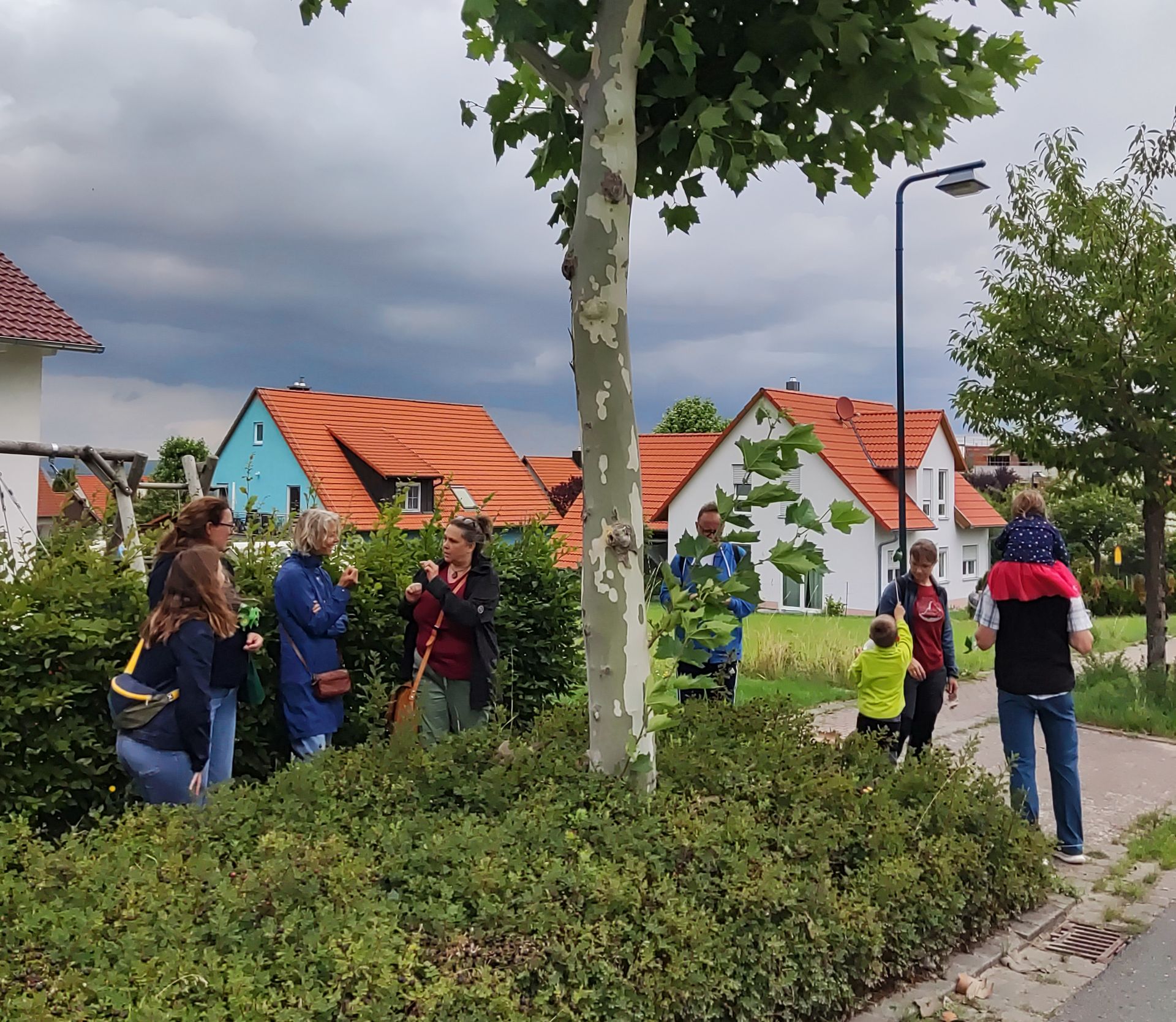 Los ging es um 10 Uhr auf dem Marktplatz. Die Vorsitzenden des Ortsvereins Burgbernheim Gudrun Schiestl-Frank und Felix Gerstner begrüßten die Teilnehmenden und übergaben das Wort an Kathrin Feindert, die durch die Stadt führte. Die erste Station war direkt der Marktplatz. Kathrin Feinert konnte das Alter der Robinien mithilfe des „Alt-Bernemer Bilderbüchla“ auf etwa 100 Jahre bestimmen. Das verdeutlicht, dass Stadtbegrünung eine sehr langfristige Angelegenheit ist.