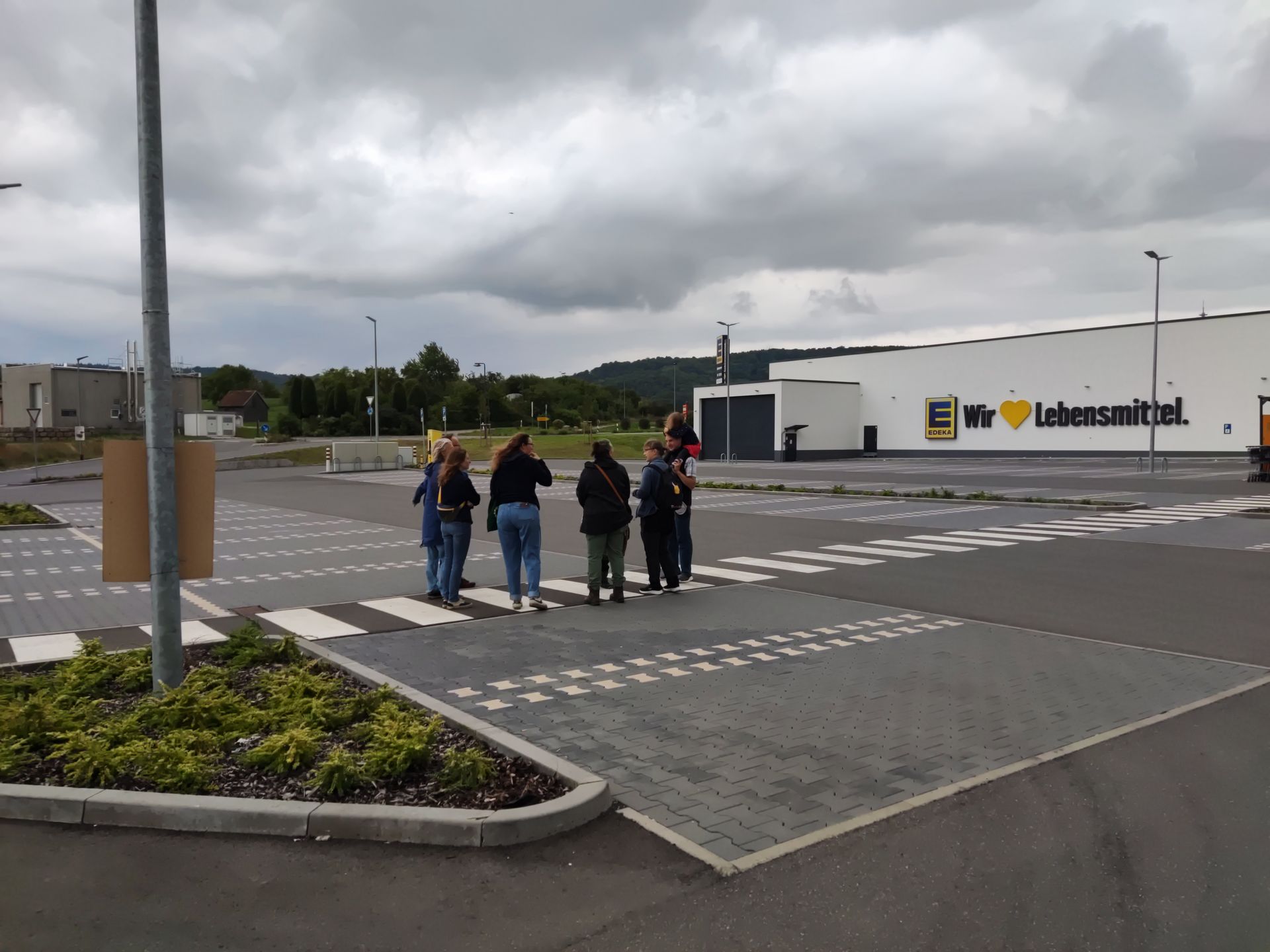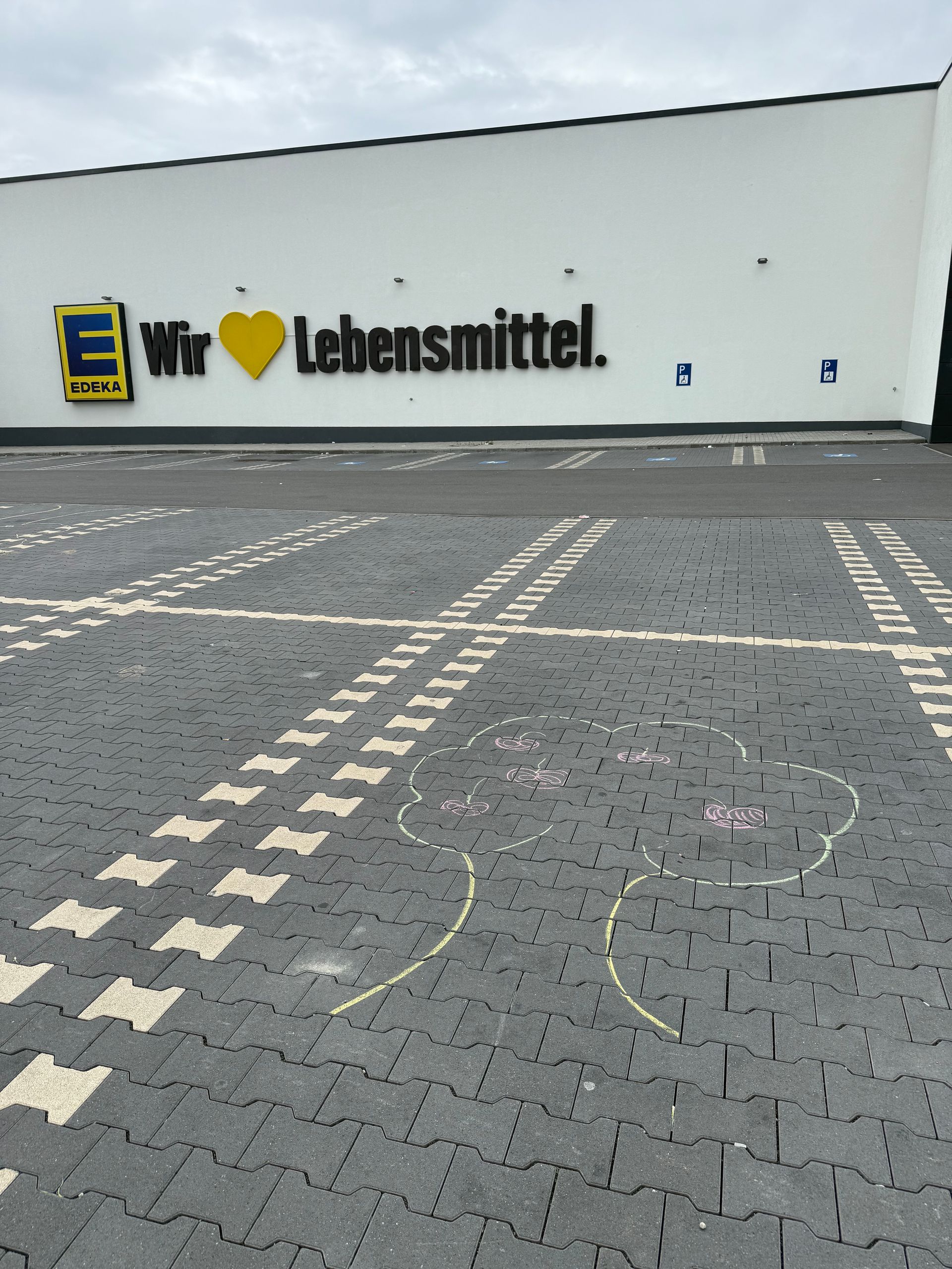 Wir setzten unseren Spaziergang zum Parkplatz des Edeka-Markts Scharrer fort. Der Supermarkt wurde mitsamt Parkplatz vor wenigen Jahren neu errichtet. Von den im Bebauungsplan eingezeichneten Bäumen war keiner zu sehen. Stattdessen eröffnete sich den Spaziergängern eine große, graue, asphaltierte oder gepflasterte Fläche. Mehrere Teilnehmende des Spaziergangs konnten nicht nachvollziehen, weshalb überhaupt ein so großer Parkplatz angelegt worden sei, denn dieser sei nie ausgelastet. Am heißen 19. Juli maß Kathrin Feindert hier eine Oberflächentemperatur von 55 °C. Den trostlosen Anblick nahmen die teilnehmenden Kinder am Spaziergang als Anlass, um Bäume mit Straßenkreide auf dem Platz zu malen.