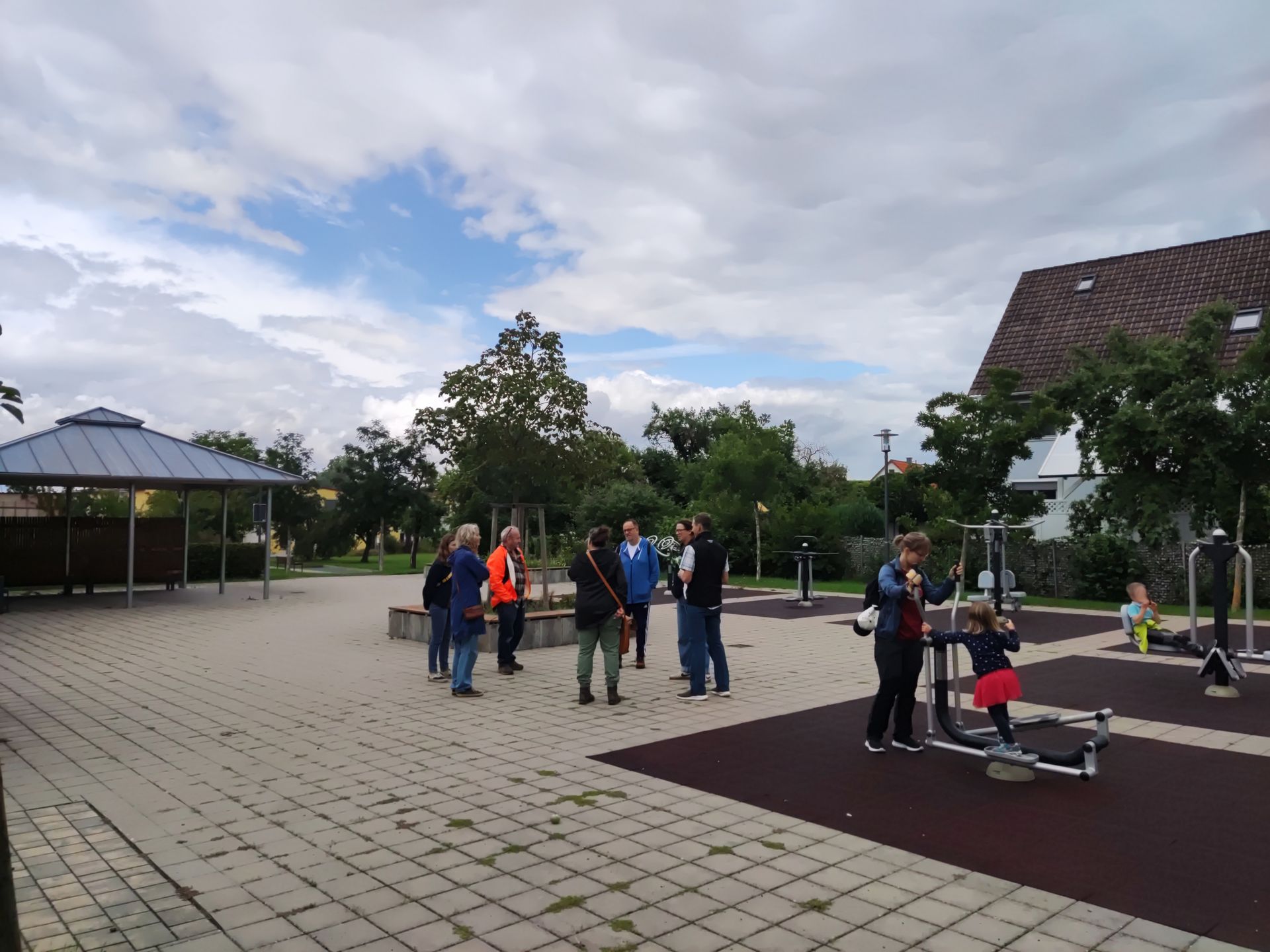 Der Bürgergarten selbst ist kein gutes Beispiel dafür, wie man öffentliche Plätze klimaresistent gestalten kann. Große Teile des Platzes sind gepflastert. Der neu gepflanzte, noch wenige Jahre junge Baum in der Mitte, kann dem Platz und den darauf installierten Seniorensportgeräten kaum Schatten spenden. An einem Ende des Platzes, an dem bis vor wenigen Jahren noch ein alter Nussbaum stand, befindet sich nun nur noch ein Blumenbeet. Kathrin Feindert nimmt an, dass der Baum das Anlagen einer Bauminsel und das Aufschütten des Bereichs um ihn herum im Zuge des Anlegens des Bürgergartens nicht überlebt hat. Auch im Bürgergarten hat sie am 19.07. die Oberflächentemperatur gemessen. Am heißesten war es auf dem Belag um die Seniorensportgeräte, der sich auf 65 °C erhitzte.